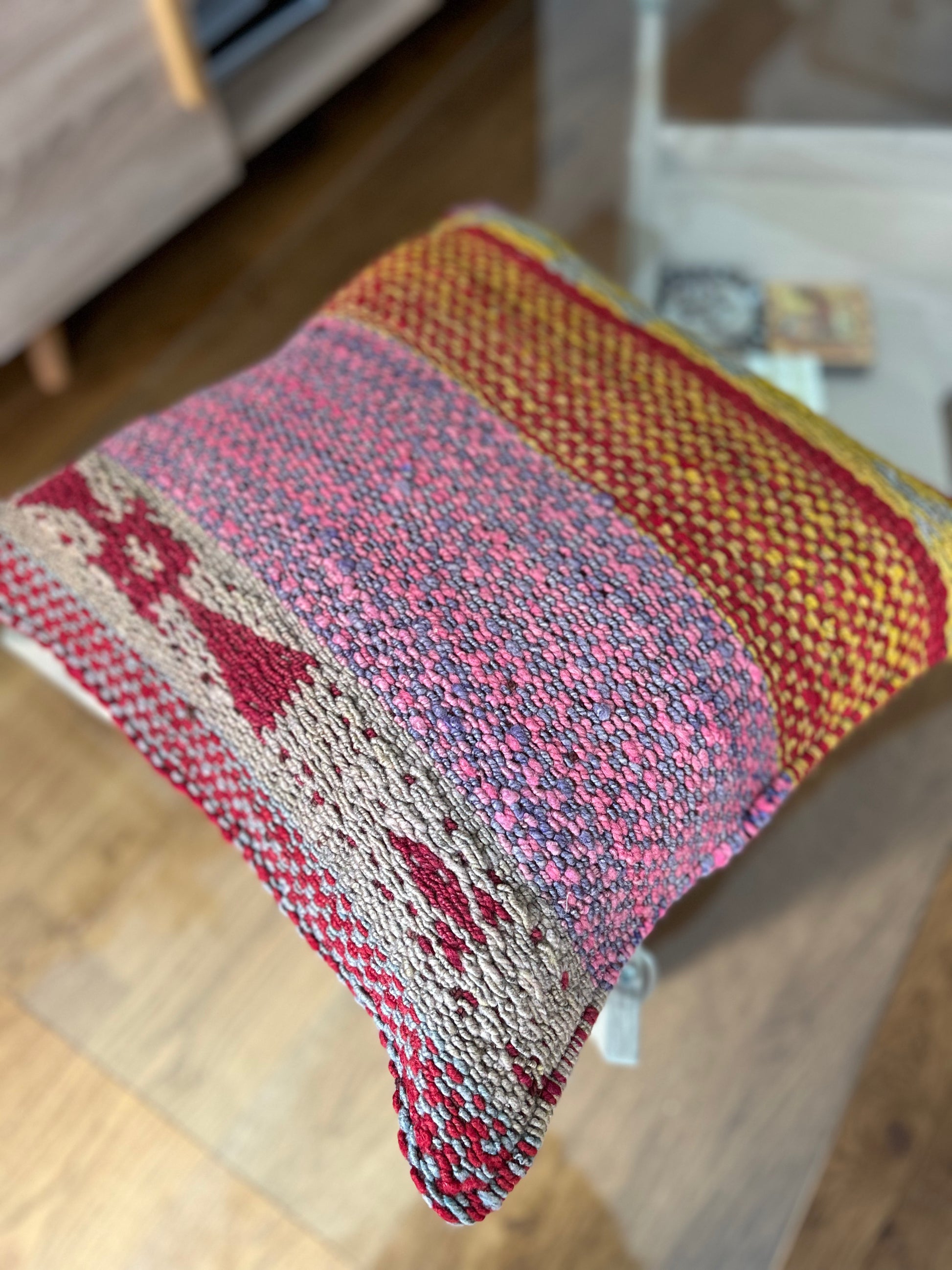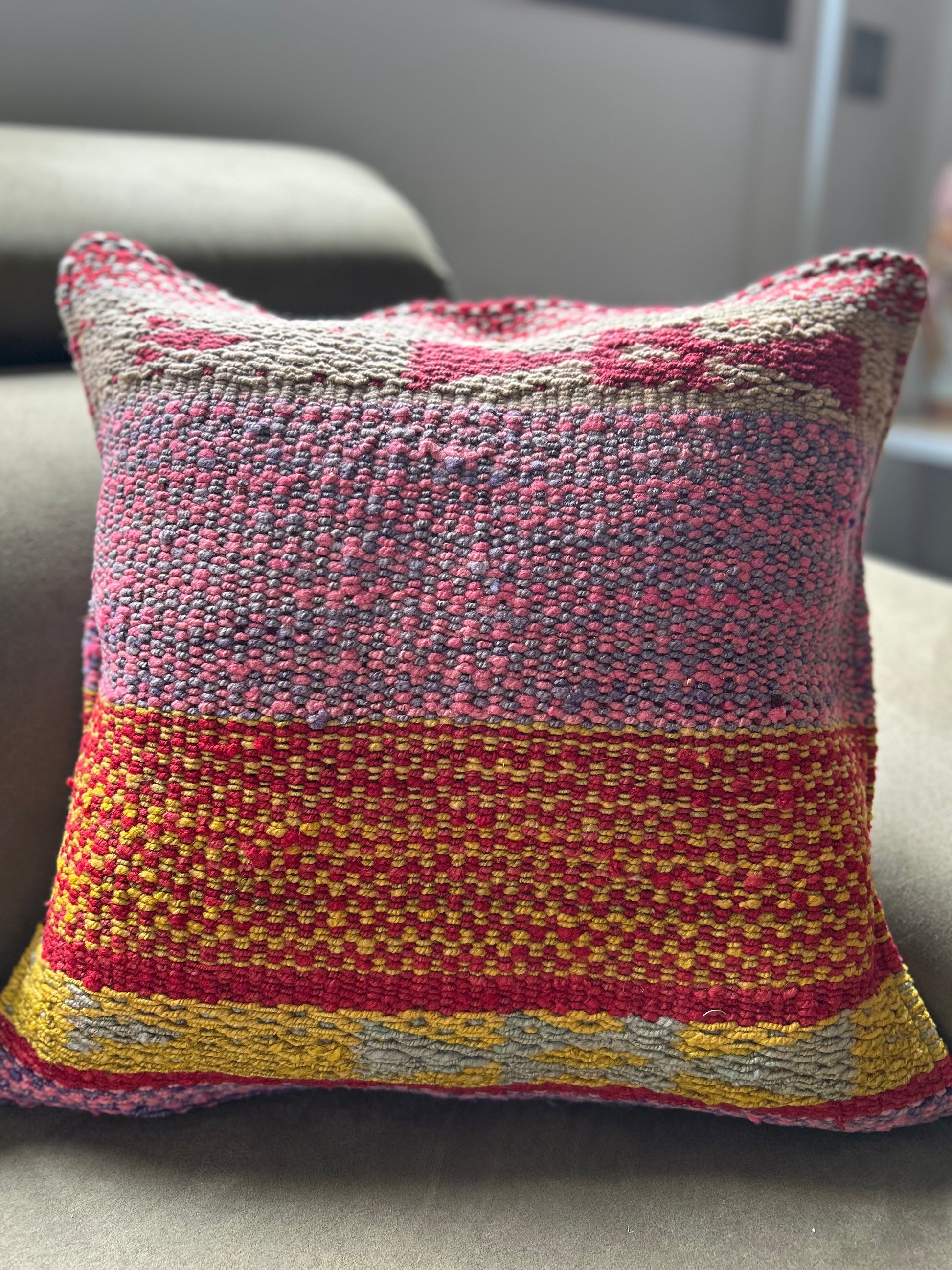 Our mixed-design cushion covers (linear and whimsical patterns) are unique, hand-knitted pieces made with sheep's wool from the high Andean communities of Cusco. Each cover is a work of art that combines the softness of natural fibers with traditional techniques.